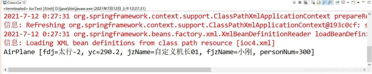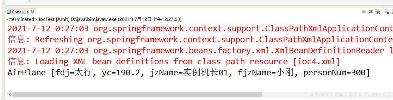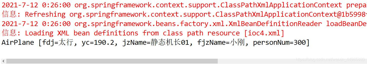 //****************利用工厂方法来创建bean************* ApplicationContext iocContext4 = new ClassPathXmlApplicationContext("ioc4.xml"); /** * 利用工厂方法创建实例 * */ @Test public void test10() { // 利用静态工厂创建实例 AirPlane airPlane01 = (AirPlane)iocContext4.getBean("airplane01"); System.out.println(airPlane01); // 利用实例工厂创建实例 AirPlane airPlane02 = (AirPlane)iocContext4.getBean("airplane02"); System.out.println(airPlane02); // 利用自定义工厂创建实例 AirPlane airPlane03 = (AirPlane)iocContext4.getBean("myFactoryBean"); System.out.println(airPlane03); }