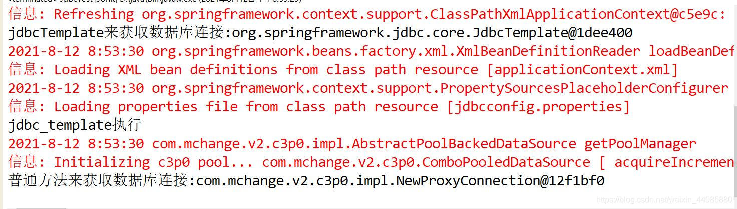 public class JdbcTest { ApplicationContext context = new ClassPathXmlApplicationContext("applicationContext.xml"); JdbcTemplate jdbcTemplate = context.getBean(JdbcTemplate.class); // 通过普通方法来获取数据库连接 @Test public void test() throws SQLException { System.out.println("jdbc_template执行"); DataSource bean = context.getBean(DataSource.class); Connection connection = bean.getConnection(); System.out.println("普通方法来获取数据库连接:" + connection); } /** * 通过jdbcTemplate来获取数据库连接 * 实验:测试数据源 * */ @Test public void test01() { System.out.println("jdbcTemplate来获取数据库连接:" + jdbcTemplate); } }