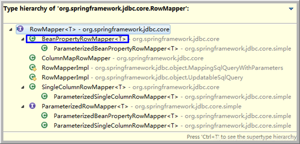 但是这里有一个坑要注意:中间传递的参数 RowMapper<Department>这个是什么呢?其实这里值的是要传递需要返回的bean对象的类型,但是在进行真正的使用的时候我们并不是通过RowMapper<Department>来映射要返回的bean对象的,而是通过它的子类BeanPropertyRowMapper,他们的继承关心是这样的: