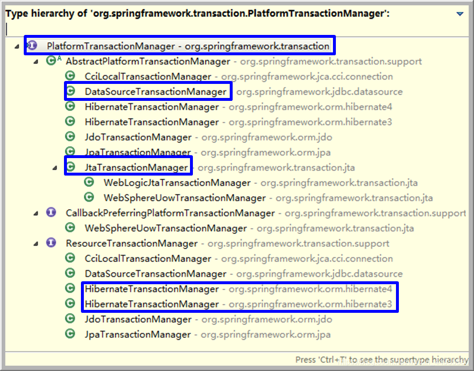 它们都是PlatformTransactionManager的子类,继承关系图如下: