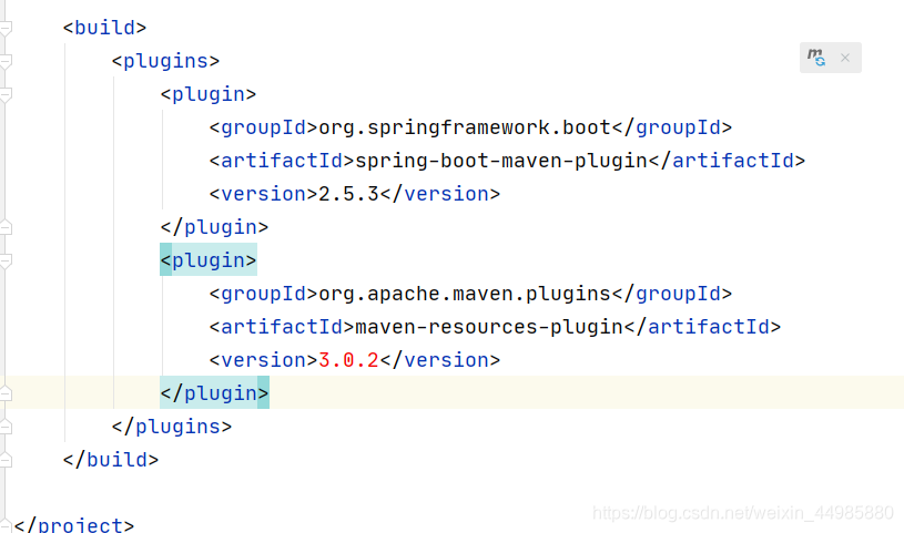 <plugin> <groupId>org.apache.maven.plugins</groupId> <artifactId>maven-resources-plugin</artifactId> <version>3.0.2</version> </plugin>