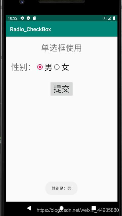 <?xml version="1.0" encoding="utf-8"?> <androidx.constraintlayout.widget.ConstraintLayout xmlns:android="http://schemas.android.com/apk/res/android" xmlns:app="http://schemas.android.com/apk/res-auto" xmlns:tools="http://schemas.android.com/tools" android:layout_width="match_parent" android:layout_height="match_parent" tools:context=".MainActivity"> <TextView android:id="@+id/title1" android:layout_width="wrap_content" android:layout_height="wrap_content" android:text="单选框使用" android:textSize="30dp" app:layout_constraintTop_toTopOf="parent" app:layout_constraintLeft_toLeftOf="parent" app:layout_constraintRight_toRightOf="parent" android:layout_marginTop="20dp" /> <TextView android:id="@+id/title_sex" android:layout_width="wrap_content" android:layout_height="wrap_content" android:text="性别:" android:textSize="30dp" app:layout_constraintTop_toBottomOf="@id/title1" app:layout_constraintLeft_toLeftOf="parent" android:layout_marginLeft="20dp" android:layout_marginTop="30dp" /> <RadioGroup android:layout_width="wrap_content" android:layout_height="wrap_content" app:layout_constraintLeft_toRightOf="@id/title_sex" app:layout_constraintBottom_toBottomOf="@id/title_sex" android:orientation="horizontal" android:layout_marginTop="30dp" > <RadioButton android:id="@+id/man" android:layout_width="wrap_content" android:layout_height="wrap_content" android:textSize="30dp" android:text="男" /> <RadioButton android:id="@+id/woman" android:layout_width="wrap_content" android:layout_height="wrap_content" android:textSize="30dp" android:text="女" /> </RadioGroup> <Button android:id="@+id/tijiao" android:layout_width="wrap_content" android:layout_height="wrap_content" android:text="提交" android:textSize="30dp" android:layout_marginTop="30dp" app:layout_constraintLeft_toLeftOf="parent" app:layout_constraintRight_toRightOf="parent" app:layout_constraintTop_toBottomOf="@id/title_sex" ></Button> </androidx.constraintlayout.widget.ConstraintLayout>