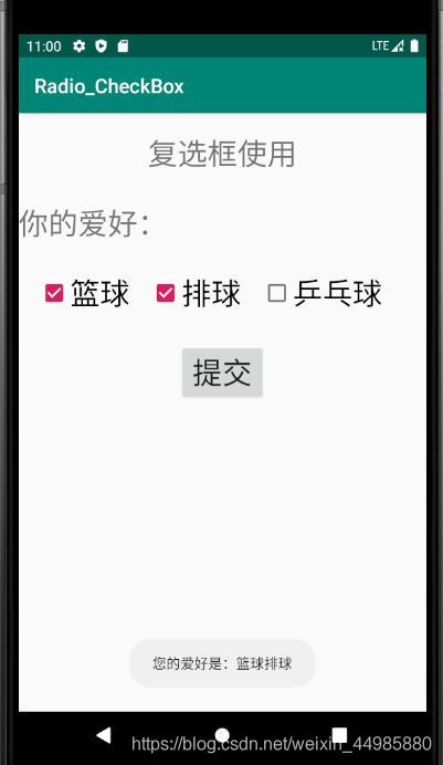 <?xml version="1.0" encoding="utf-8"?> <androidx.constraintlayout.widget.ConstraintLayout xmlns:android="http://schemas.android.com/apk/res/android" xmlns:app="http://schemas.android.com/apk/res-auto" xmlns:tools="http://schemas.android.com/tools" android:layout_width="match_parent" android:layout_height="match_parent" tools:context=".MainActivity"> <TextView android:id="@+id/title1" android:layout_width="wrap_content" android:layout_height="wrap_content" android:text="复选框使用" android:textSize="30dp" app:layout_constraintTop_toTopOf="parent" app:layout_constraintLeft_toLeftOf="parent" app:layout_constraintRight_toRightOf="parent" android:layout_marginTop="20dp" /> <TextView android:id="@+id/title_aihao" android:layout_width="wrap_content" android:layout_height="wrap_content" android:text="你的爱好:" android:textSize="30dp" app:layout_constraintTop_toBottomOf="@id/title1" app:layout_constraintLeft_toLeftOf="parent" android:layout_marginTop="30dp" /> <CheckBox android:id="@+id/lanqiu" android:layout_width="wrap_content" android:layout_height="wrap_content" android:text="篮球" android:textSize="30dp" app:layout_constraintTop_toBottomOf="@id/title_aihao" app:layout_constraintLeft_toLeftOf="parent" android:layout_marginLeft="20dp" android:layout_marginTop="30dp" /> <CheckBox android:id="@+id/paiqiu" android:layout_width="wrap_content" android:layout_height="wrap_content" android:text="排球" android:textSize="30dp" app:layout_constraintTop_toBottomOf="@id/title_aihao" app:layout_constraintLeft_toRightOf="@id/lanqiu" android:layout_marginLeft="20dp" android:layout_marginTop="30dp" /> <CheckBox android:id="@+id/pingpangqiu" android:layout_width="wrap_content" android:layout_height="wrap_content" android:text="乒乓球" android:textSize="30dp" app:layout_constraintTop_toBottomOf="@id/title_aihao" app:layout_constraintLeft_toRightOf="@id/paiqiu" android:layout_marginLeft="20dp" android:layout_marginTop="30dp" /> <Button android:id="@+id/tijiao" android:layout_width="wrap_content" android:layout_height="wrap_content" android:text="提交" android:textSize="30dp" android:layout_marginTop="30dp" app:layout_constraintLeft_toLeftOf="parent" app:layout_constraintRight_toRightOf="parent" app:layout_constraintTop_toBottomOf="@id/lanqiu" ></Button> </androidx.constraintlayout.widget.ConstraintLayout>