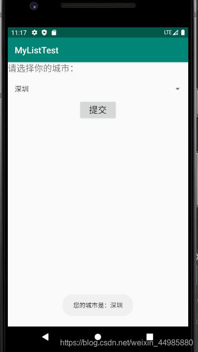 <?xml version="1.0" encoding="utf-8"?> <androidx.constraintlayout.widget.ConstraintLayout xmlns:android="http://schemas.android.com/apk/res/android" xmlns:app="http://schemas.android.com/apk/res-auto" xmlns:tools="http://schemas.android.com/tools" android:layout_width="match_parent" android:layout_height="match_parent" tools:context=".MainActivity"> <TextView android:id="@+id/text1" android:layout_width="wrap_content" android:layout_height="wrap_content" android:text="请选择你的城市:" android:textSize="20dp" ></TextView> <Spinner android:id="@+id/sp1" android:layout_width="match_parent" android:layout_height="wrap_content" app:layout_constraintTop_toBottomOf="@id/text1" android:layout_marginTop="10dp" android:entries="@array/array2" ></Spinner> <Button android:id="@+id/tijiao" android:layout_width="wrap_content" android:layout_height="wrap_content" android:text="提交" android:textSize="20dp" app:layout_constraintTop_toBottomOf="@id/sp1" app:layout_constraintLeft_toLeftOf="parent" app:layout_constraintRight_toRightOf="parent" ></Button> </androidx.constraintlayout.widget.ConstraintLayout>