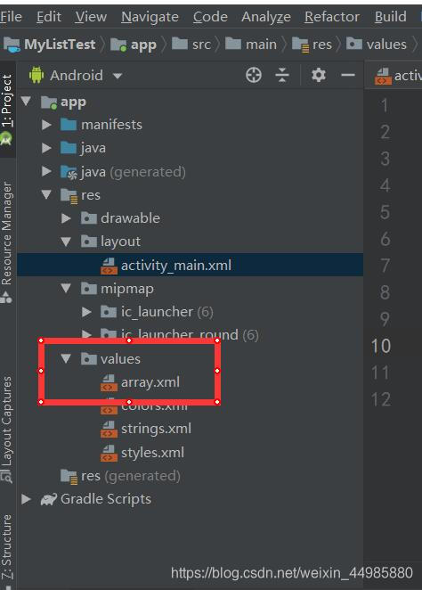 我们以下拉框为例进行设置,列表框方法一样。使用该方法设置参数的优点就是省去了数组元素需要添加到ArrayAdapter容器中繁琐,并且方便之后在xml文件中添加选择项。首先我们应该在项目中res—>values文件下建立一个xml文件,我在这里命名为array.xml,