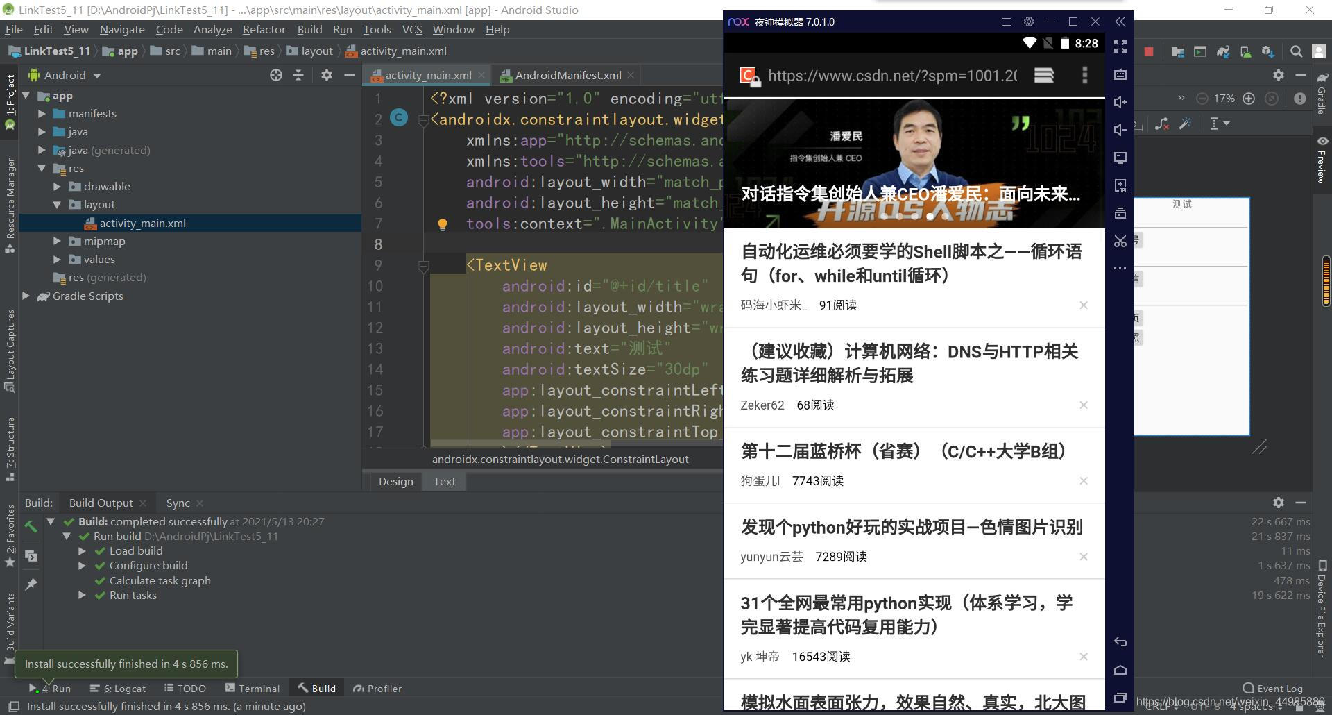 <?xml version="1.0" encoding="utf-8"?> <androidx.constraintlayout.widget.ConstraintLayout xmlns:android="http://schemas.android.com/apk/res/android" xmlns:app="http://schemas.android.com/apk/res-auto" xmlns:tools="http://schemas.android.com/tools" android:layout_width="match_parent" android:layout_height="match_parent" tools:context=".MainActivity"> <EditText android:id="@+id/htmlUrl" android:layout_width="match_parent" android:layout_height="50dp" android:layout_marginTop="10dp" ></EditText> <Button android:id="@+id/htmlUrl_bt" android:layout_width="wrap_content" android:layout_height="wrap_content" android:text="浏览大佬文章" android:textSize="30dp" app:layout_constraintTop_toBottomOf="@id/htmlUrl" ></Button> </androidx.constraintlayout.widget.ConstraintLayout>