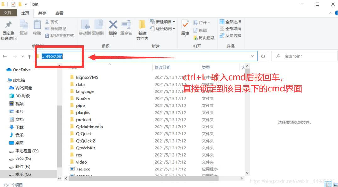 我先是找到“夜神模拟器”的安装路径“\Nox\bin”,一个CTRL+L,再输入一个“cmd”,最后一个回车,直接锁定到了该路径下的cmd命令界面,好家伙!女朋友都看呆了,这让她又学到了一手!再也不用打开cmd手动输入路径进行锁定了。
