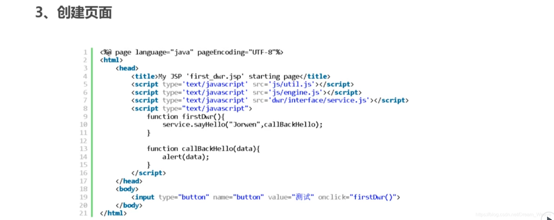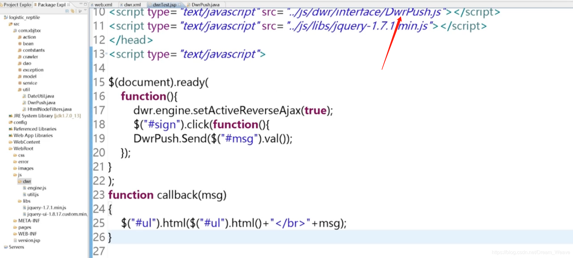 注意三个js顺序。dwr中js文件的引入,其中util.js和engine.js固定,dwr/interface/service.js,dwr为当前项目名,interface为固定格式,service为当前类名,最后加上“.js”即可。