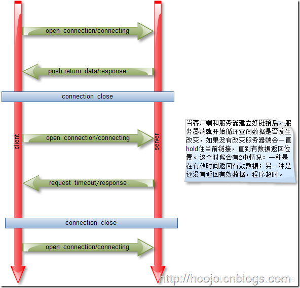 浏览器发起一个“询问”请求,当没有新数据时,服务器端并不立即响应,而是等待数据,当有新数据产生时,才向浏览器响应,一个HTTP连接结束。