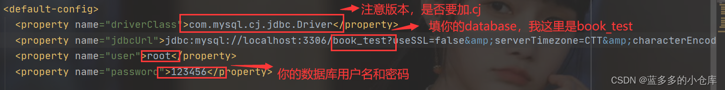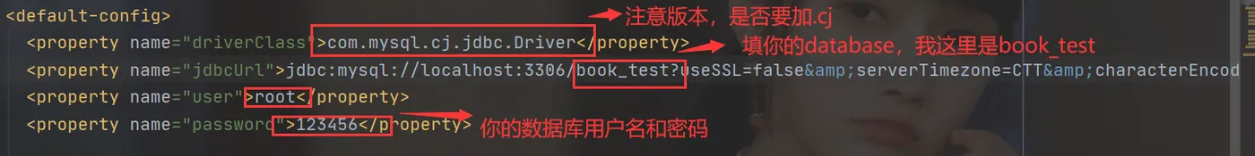<?xml version="1.0" encoding="UTF-8"?> <c3p0-config> <!-- C3P0的缺省(默认)配置, 如果在代码中“ComboPooledDataSource ds = new ComboPooledDataSource();”这样写就表示使用的是C3P0的缺省(默认)配置信息来创建数据源 --> <default-config> <property name="driverClass">com.mysql.cj.jdbc.Driver</property> <property name="jdbcUrl">jdbc:mysql://localhost:3306/book_test?useSSL=false&serverTimezone=CTT&characterEncoding=utf8</property> <property name="user">root</property> <property name="password">123456</property> <property name="acquireIncrement">5</property> <property name="initialPoolSize">10</property> <property name="minPoolSize">5</property> <property name="maxPoolSize">20</property> </default-config> <!-- C3P0的命名配置, 如果在代码中“ComboPooledDataSource ds = new ComboPooledDataSource("MySQL");”这样写就表示使用的是name是MySQL的配置信息来创建数据源 --> <named-config name="MySQL"> <property name="driverClass">com.mysql.cj.jdbc.Driver</property> <property name="jdbcUrl">jdbc:mysql://localhost:3306/book_test?useSSL=false&serverTimezone=CTT&characterEncoding=utf8</property> <property name="user">root</property> <property name="password">123456</property> <property name="acquireIncrement">5</property> <property name="initialPoolSize">10</property> <property name="minPoolSize">5</property> <property name="maxPoolSize">20</property> </named-config> </c3p0-config>