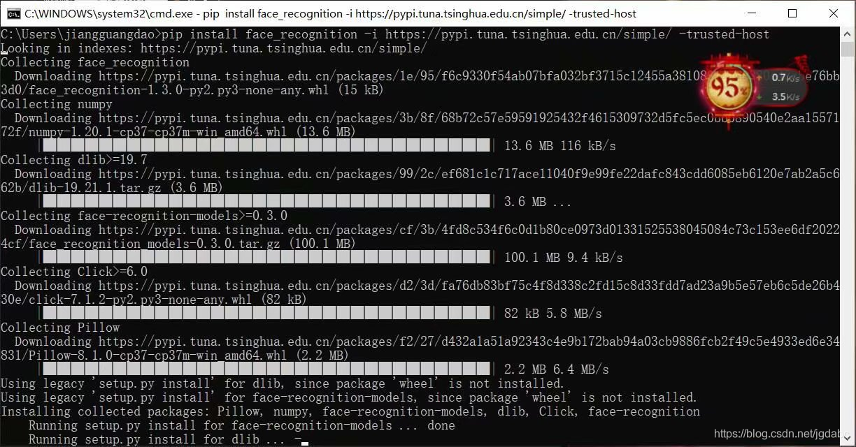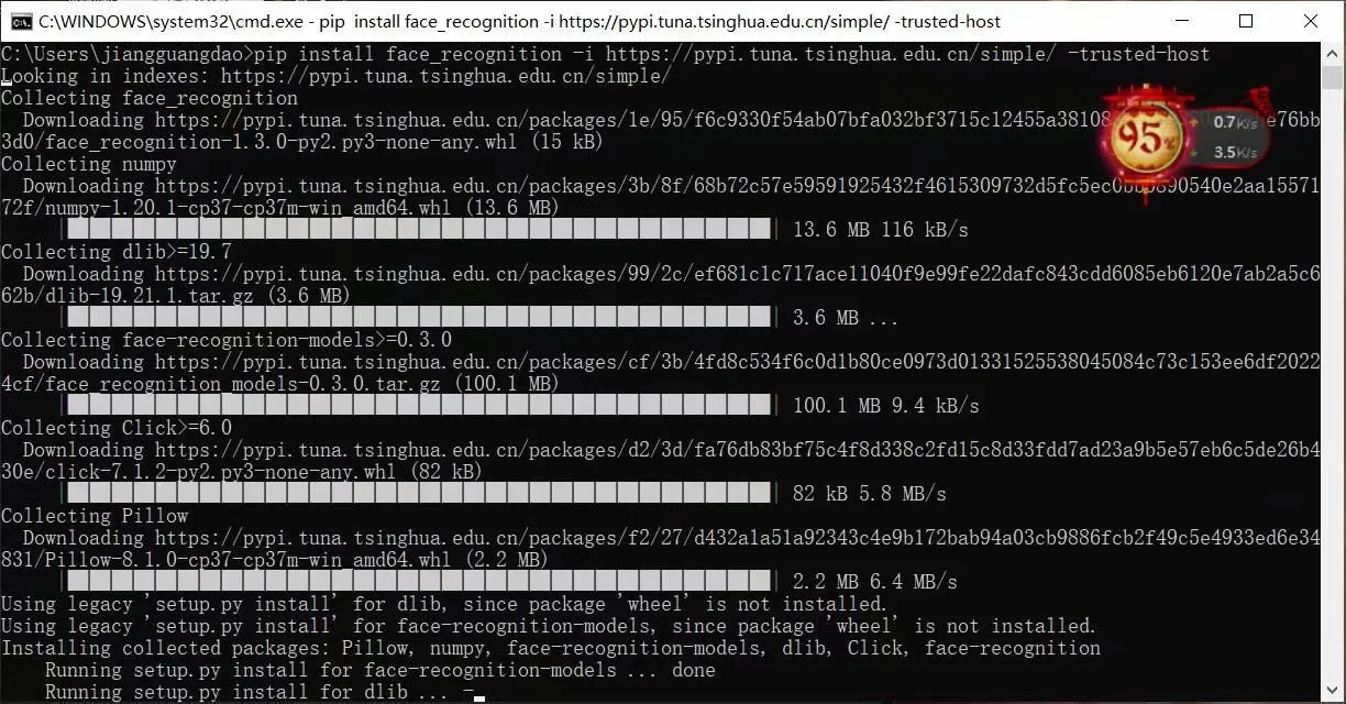 同理,我们导入face_recognition时,我们这样在控制台这样写:pip install face_recognition -i 镜像源 -trusted-host