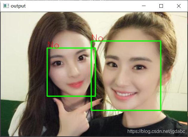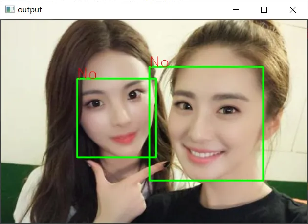 #import sys #python内置库 import cv2 #计算机视觉领域 import face_recognition #人脸识别库,如果读取图片的话,会是图像矩阵 #就是每个图片的rgb # 1.人脸数据 # 2.算法 # 3.建立模型 # 4.训练模型 # 5.测试模型 # 6.上线使用 # 1读取 face_image = face_recognition.load_image_file("E://1.jpg")#读取图片 # 2进行人脸特征提取 向量化 #128维的五官数据 face_encoding = face_recognition.face_encodings(face_image) # 3人脸位置 face_locations = face_recognition.face_locations(face_image) # 判断 n = len(face_encoding) #如果超过连个人就退出来 if n>2: print('超过两个人') sys.exit() face1 = face_encoding[0] face2 = face_encoding[1] # 4比较 阈值 tolerance指定容错率,越小越严格 result = face_recognition.compare_faces([face1],face2,tolerance=0.5) if result == [True] : print(1) name = 'Yes' else : print(0) name = 'No' #绘图 for i in range(len(face_encoding)): face_encoding = face_encoding[i] face_location = face_locations[i] top,right,bottom,left = face_location #画框 图像 位置 颜色 粗细 cv2.rectangle(face_image,(left,top),(right,bottom),(0,255,0),2) #写字 cv2.putText(face_image,name,(left,top),cv2.FONT_HERSHEY_SIMPLEX,0.8,(255,0,0,2)) face_image_rgb = cv2.cvtColor(face_image,cv2.COLOR_BGR2RGB) # 展示图像 cv2.imshow("output",face_image_rgb) #防止闪退 cv2.waitKey(0)