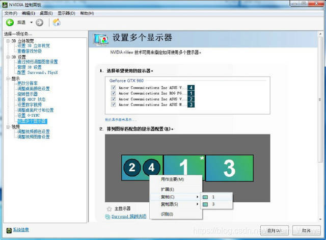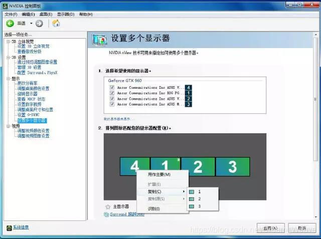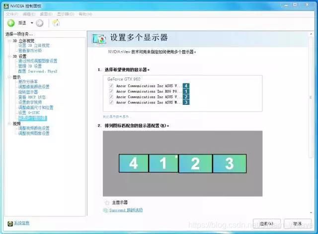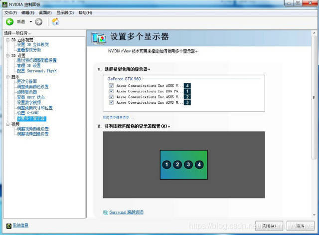 1.右击桌面空白处,进入Nvidia显卡控制台,选择‘设置多个显示器’,在这里可以看到已经识别到连接的四个显示器: