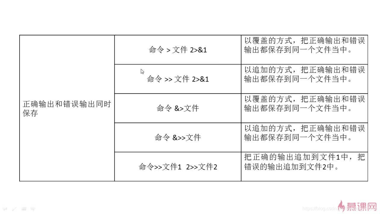 命令 2>(2>>)文件 “覆盖(追加)方式把命令的错误输出 输出到指定文件或设备中”注意带2的错误输出后面不能有空格