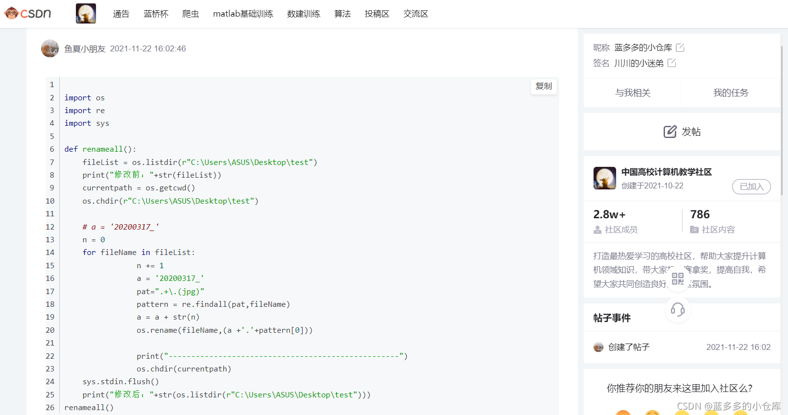 2、使用os.renames代替os.rename。os.rename仅更改了最上层目录的名称,因此,它会在“ C:\Users\ASUS\Desktop\test”中查找“ test(1).jpg”(该目录不存在嗷)。os.renames调用rename(),在调用之前,使用makedirs()递归创建目录。本质上os.renames()应该是通过makedirs()来实现递归的。