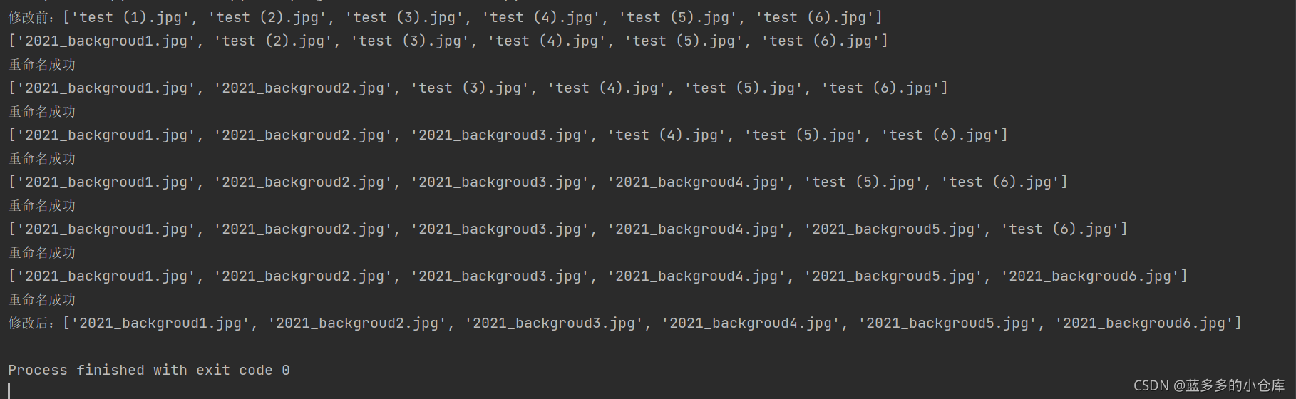 import os import re import sys def renameall(): fileList = os.listdir('../test_pic') print("修改前:" + str(fileList)) os.chdir('../test_pic') n = 0 for fileName in fileList: n += 1 a = '2021_backgroud' pat = ".+\.(jpg)" pattern = re.findall(pat, fileName) a = a + str(n) os.renames(fileName, (a + '.' + pattern[0])) print(os.listdir('../test_pic')) print("重命名成功") sys.stdin.flush() print("修改后:" + str(os.listdir('../test_pic'))) renameall()