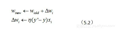 如此一来,感知机的学习规则就可以更加简单明了,对于训练样例(x,y)(需要注意的是,这里粗体字x表示训练集合),若当前感知机的实际输出y’,假设它不符合预期,存在“落差”,那么感知机的权值依据如公式(5.2)规则调整: