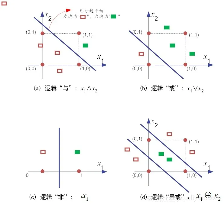 前面的章节中,我们提到的那位人工智能泰斗明斯基(Minsky)已经证明,若两类模式是线性可分的,那么一定存在一个线性超平面可以将它们区分开来,如图5-6(a)-(c)所示。也就是说,这样的感知机,其学习过程一定会稳定(即收敛)下来,神经网络的权值可以学习得到。