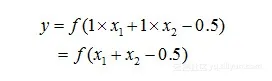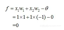 (2)类似地,“或(x1∨x2)”:当w1=w2=1,阈值θ=0.5时,有: