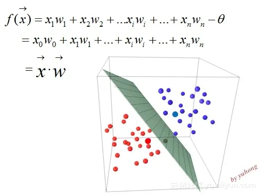 这样一来的话,对于超平面一侧的实例,感知机输出为1(或称判定为某一类),而对于超平面的另外一侧实例,感知机输出为0(判定为另外一类)。