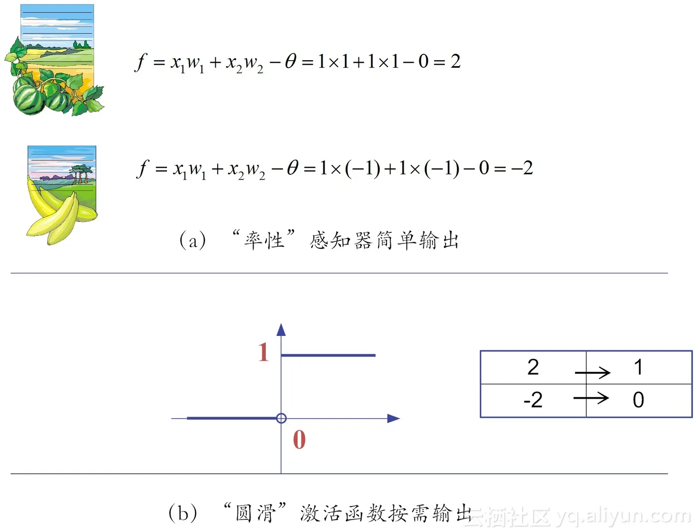 从图5-2(a)所示的输出可以看到,对西瓜的判定输出结果是2,而香蕉的为-2。而我们先前预定的规则是:函数输出为1,则判定为西瓜,输出为0,则判定为香蕉,那么如何将2或-2这样的分类结果,变换成预期的分类表达呢,这个时候,就需要激活函数上场了!