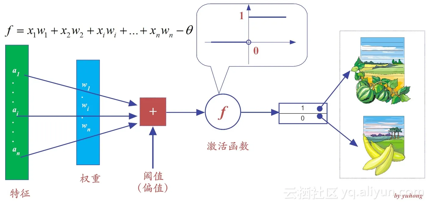 假设特征x1代表输入颜色,特征x2代表形状,权重w1和w2默认值都为1,为了进一步简化,我们把阈值θ(亦有教程称之为偏值——bias)设置为0。为了标识方便,我们将感知器输出为“1”,代表判定为“西瓜”,而输出为“0”,代表判定为“香蕉”。当然了,如果有更多类别的物品,我们就用更多的数字来标记即可。
