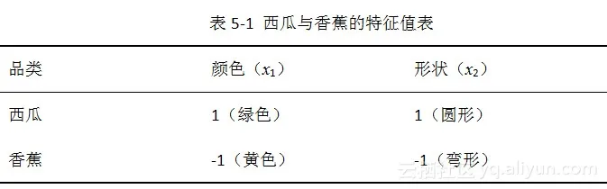 为了方便机器计算,我们对颜色和形状这两个特征,给予不同的值,以示区别。比如,颜色这个特征为绿色时,x1取值为1,而当颜色为黄色时,x1取值为-1;类似地,如果形状这个特征为圆形,x2取值为1,反之,形状为弯曲状时,x2取值为-1,如表5-1所示。