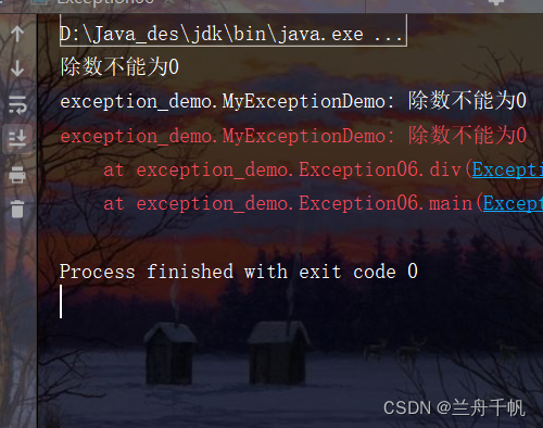 package exception_demo; public class Exception06 { public static void main(String args[]) { int result = 0; try { result = div(2,0); System.out.println(result); } catch (MyExceptionDemo e) { System.out.println(e.getMessage());//我们可以对比这三种答应方式。 System.out.println(e.toString()); e.printStackTrace(); } } static int div(int a,int b) throws MyExceptionDemo { if(b == 0) { throw new MyExceptionDemo("除数不能为0"); } return a/b; } }