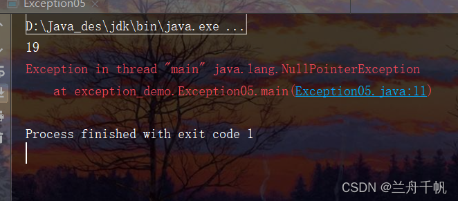 package exception_demo; public class Exception05 { private String name = ""; private int age = 19; public static void main(String args[]) { Exception05 ex = new Exception05(); Exception05 ex01 = null; try { ex01 = null; System.out.println(ex.age); System.out.println(ex01.name); } catch (NullPointerException e) { e.printStackTrace(); } } }