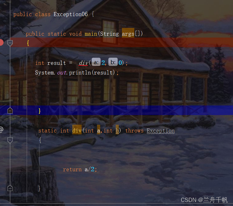 我在div方法外部进行了异常的声明,说明这个方法这里可能会出现异常,于是在主函数你调用这个方法的时候你必须进行处理,不然编译时不会通过的。