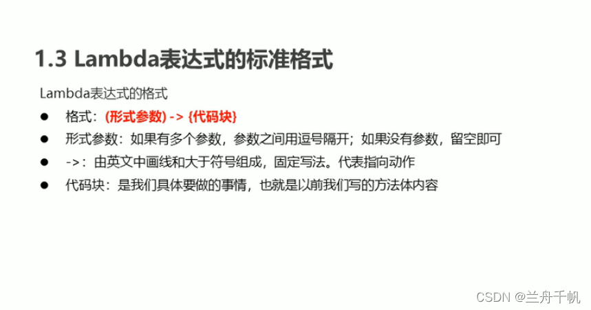 对比上面的说明格式,你应该注意到这种格式。lambda里面有一个(),括号里面要求的是一种形式参数,但是你可以注意到我们这里英勇的接口没有使用形式参数,所以可以省略掉,然后剩下的就是你想做的事情了。所以就是这样的格式。