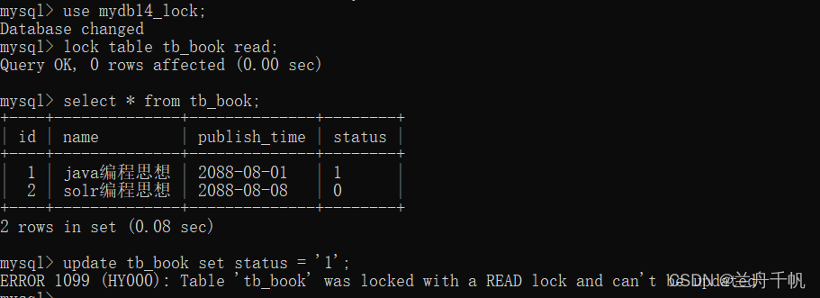 我们发现就连简单的查询也是不可以,所以以此亦可以说明,我们这样的读锁说明了一个资源的占用,并且你只能操作当前锁的资源。