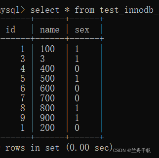 drop table if exists test_innodb_lock; create table test_innodb_lock( id int(11), name varchar(16), sex varchar(1) )engine = innodb ; insert into test_innodb_lock values(1,'100','1'); insert into test_innodb_lock values(3,'3','1'); insert into test_innodb_lock values(4,'400','0'); insert into test_innodb_lock values(5,'500','1'); insert into test_innodb_lock values(6,'600','0'); insert into test_innodb_lock values(7,'700','0'); insert into test_innodb_lock values(8,'800','1'); insert into test_innodb_lock values(9,'900','1'); insert into test_innodb_lock values(1,'200','0'); create index idx_test_innodb_lock_id on test_innodb_lock(id); create index idx_test_innodb_lock_name on test_innodb_lock(name);