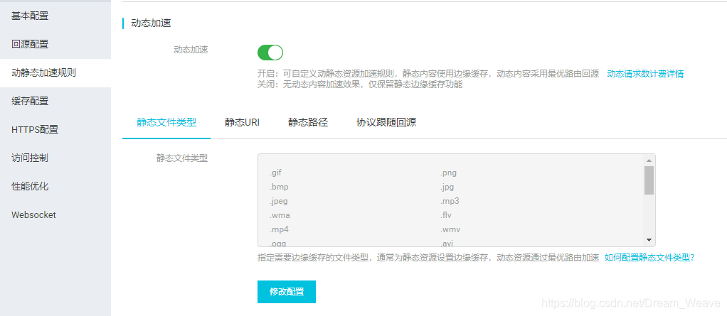所谓阿里云的全站加速,无非就是对动态内容(asp/.net/jsp/php等动态文件)和静态内容(jpg、png、gif等图片资源/js/css/html)等),也就是说,你网站的所有文件都可以给你加速,这也是和单纯的阿里云CDN有所区别的地方。我们看全站加速的界面如下。
