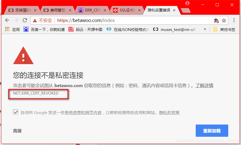问题如下图所示,无论打开什么常用的网页,都提示这个,一开始以为在 “高级” 里点击 “继续访问” 即可,却没想到连这个按钮都没,而且每个网址访问都这样,想必是 Fiddler 在捣腾,于是想到是否证书的问题。