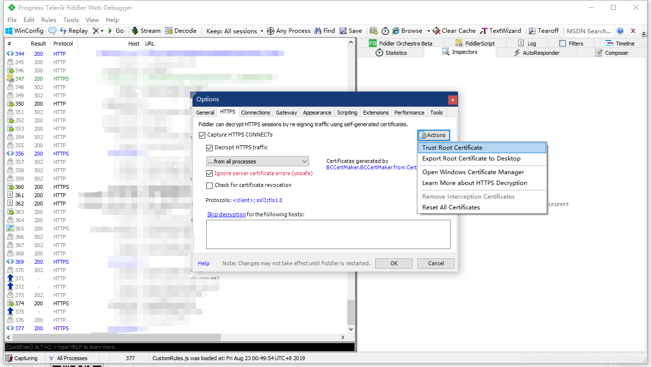 Fiddler 解决方案,如下图所示,点击 "Trust Root Certificate" ,然后默认类似 “下一步” 走完,记得重启 Fiddler,然而惊奇的就好了。