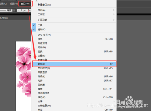2、在软件AI菜单栏中,点击“窗口”—“图层”,或者使用快捷键F7,打开图层面板,(如果图层面板有显示,此步骤可以略过)