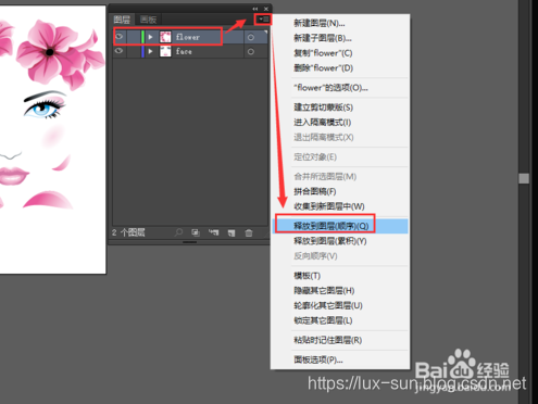 3、鼠标左键点击图层,再点击图层面板右上角“下拉小三角”,弹出下拉菜单,点击“释放到图层(顺序)(Q)”;依次操作下面的其他图层,每个图层都要做相应的释放操作