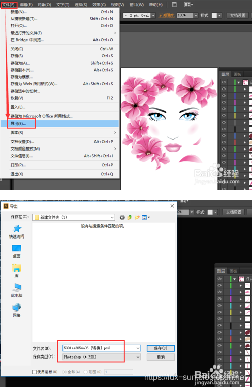 5、点击软件 AI 菜单栏 --- 文件 --- 导出,也可以使用快捷 Ctrl+E,导出文件,保存类型选择“Photoshop(*PSD)”,然后点保存