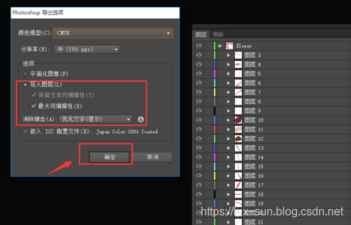 6、在弹出对话框中,有选项框,点击“写入图层”选项,“保留文本可编辑性”和“最大可编辑性”都勾选,然后点击“确定”按钮