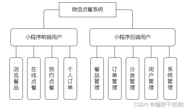 根据上述对微信小程序点餐系统的功能性需求分析,设计出了微信小程序点餐系统的功能结构图,如下图1-1所示。