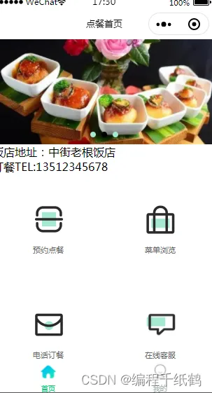 微信小程序点餐前端主要就是实现点餐操作,主要包含预约点餐、菜单浏览、电话订餐、客服个模块。具体操作界面展示如下图4-1所示。