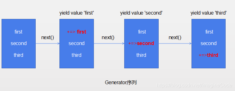 next函数被调用后,生成器就开始执行代码,当代码直行道yield关键字时,就会生成一个中间结果(生成值序列中的一项),然后返回一个新对象,其中封装了结果值(value)和一个指示完成的指示器(done)。