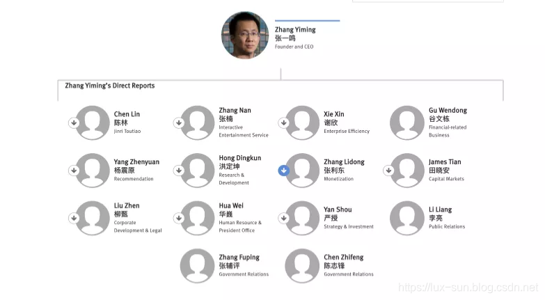 字节跳动没有CFO、CMO或CTO,14名高管直接向CEO张一鸣汇报,涵盖公司所有职能,“为此,张一鸣先生表示,感觉自己太多的时间用在与团队主管开会上。”扁平化的管理下,普通基层员工到“王座”之间的汇报关系只有3到4级,全公司共用技术、国际化、商业化、审核及销售团队。