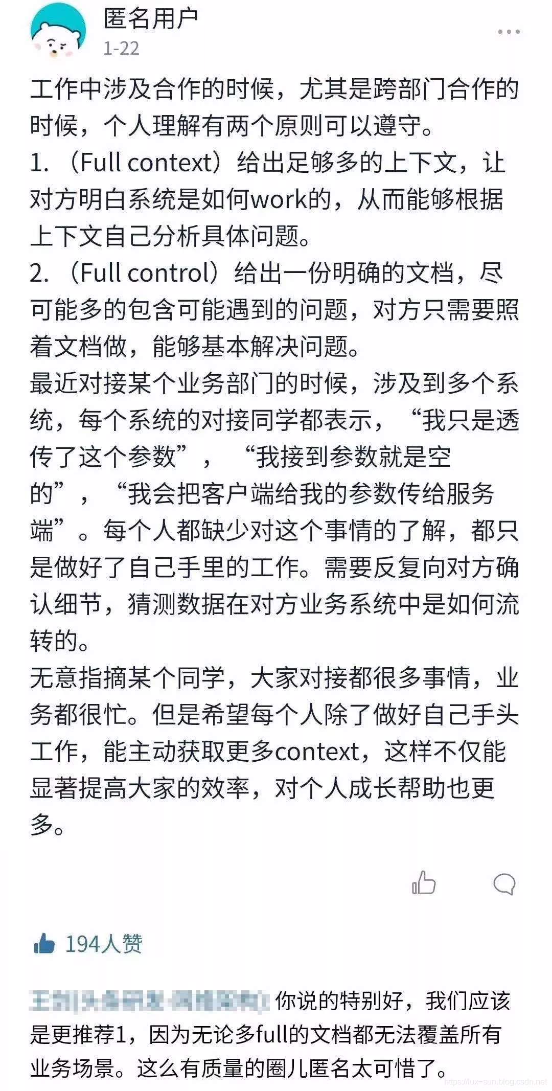 他给出建议的原因是,他对接某个业务部门,涉及到多个系统,每个系统的对接人“都只是做好了自己手里的工作,需要反复向对方确认细节”,很消耗成本。他希望对方能给出一个全语境的信息,不要让他去“猜”。“无意指摘某个同学,大家都对接很多事情,业务都很忙。但是希望每个人除了做好自己手头工作,能主动获取更多context。”他说,“这样不仅能显著提高大家的效率,对个人成长帮助也很多。”