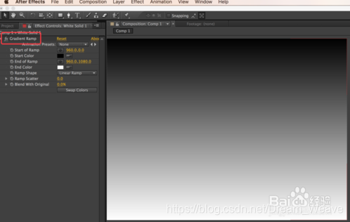 另外,在After Effects中,我们可以新建固态层然后给固态层一个ramp特效来生成渐变,如图,生成的渐变也同样有色带波纹产生。