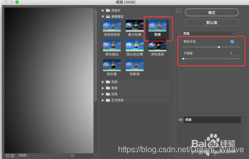 选中渐变图层,打开滤镜库/画笔描边/喷溅先把平滑度直接调成1,再调喷色半径,如图所示。
