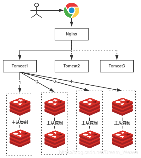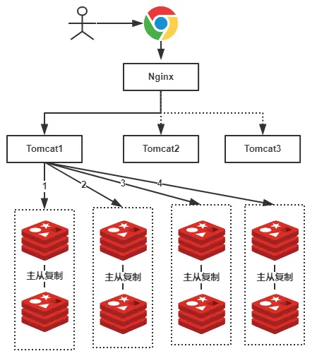 我们在使用Redis的时候,为了保证Redis的高可用,提高Redis的读写性能,最简单的方式我们会做主从复制,组成Master-Master或者Master-Slave的形式,或者搭建Redis集群,进行数据的读写分离,类似于数据库的主从复制和读写分离。如下所示: