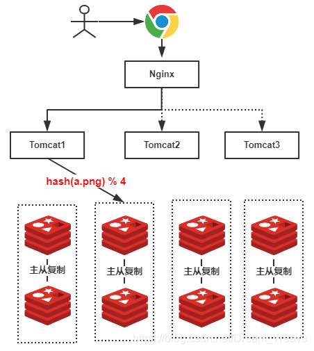 上图中,假设我们查找的是”a.png”,由于有4台服务器(排除从库),因此公式为 hash(a.png) % 4 = 2,可知定位到了第2号服务器,这样的话就不会遍历所有的服务器,大大提升了性能!