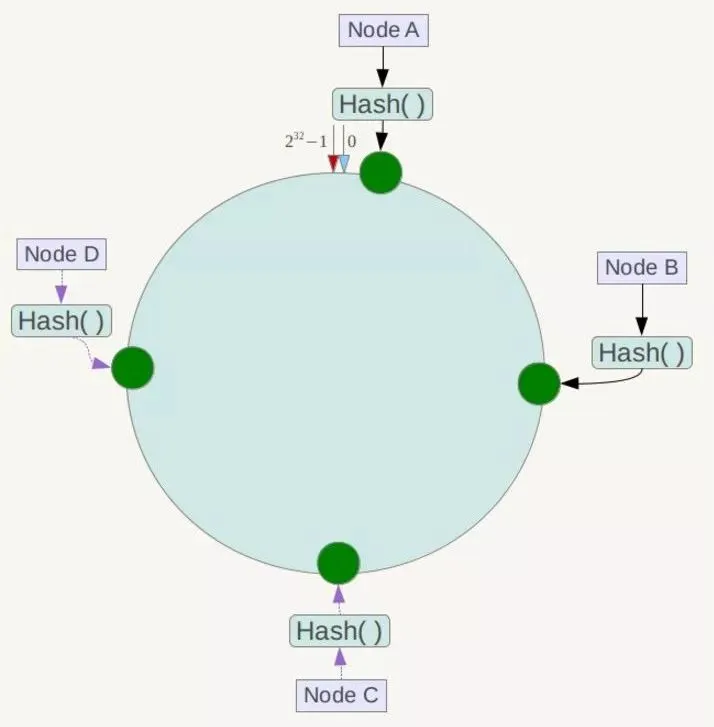 根据一致性Hash算法,数据A会被定为到Node A上,B被定为到Node B上,C被定为到Node C上,D被定为到Node D上。
